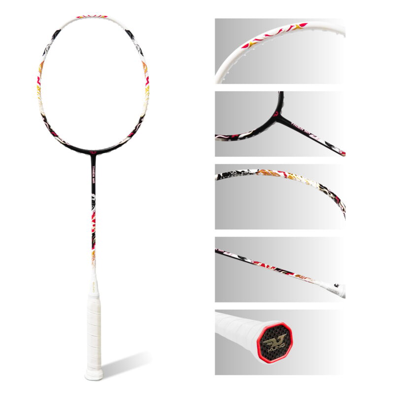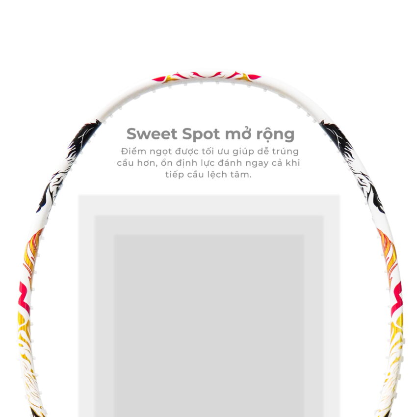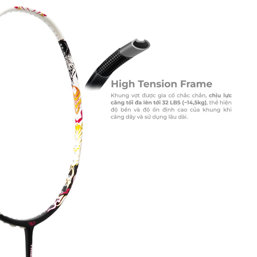 - High Tension Frame Khung vợt được gia cố chắc chắn, chịu lực căng tối đa lên tới 32 LBS (~14,5kg), thể hiện độ bền và độ ổn định cao của khung khi căng dây và sử dụng lâu dài.