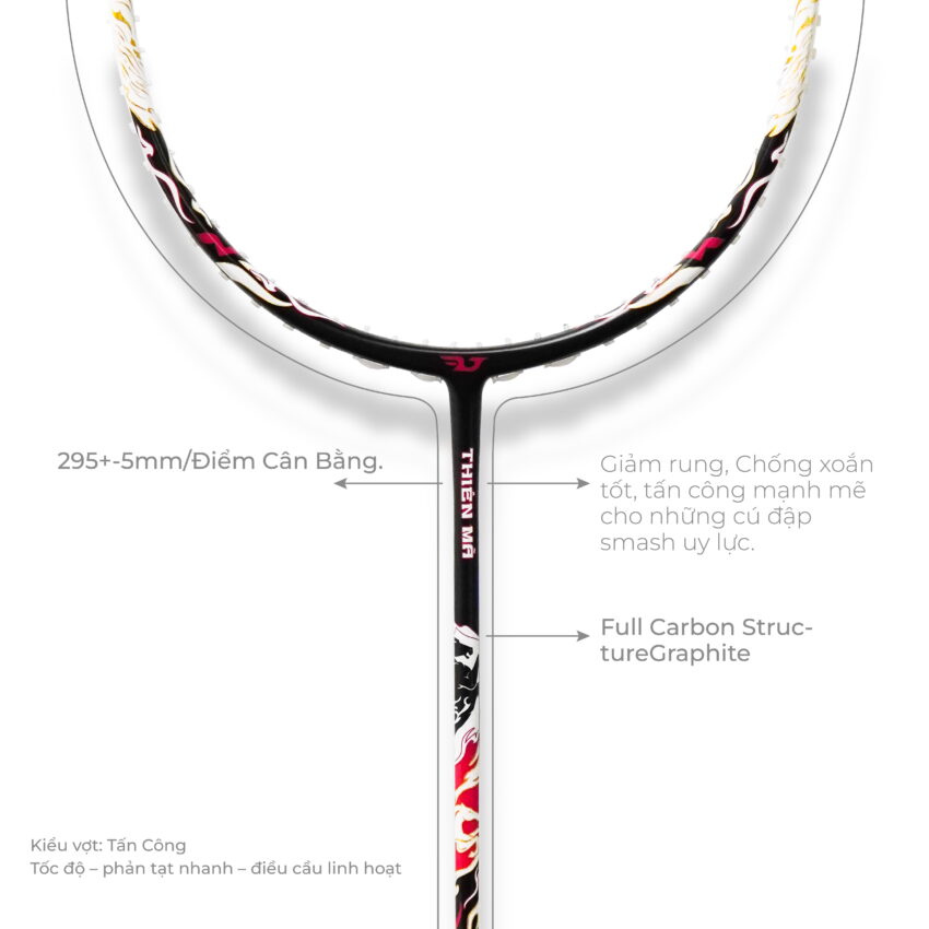 - Full Carbon Structure Cấu trúc carbon toàn thân giúp vợt nhẹ nhưng chắc, giảm rung, cho cảm giác cầu rõ ràng và kiểm soát tốt hơn.