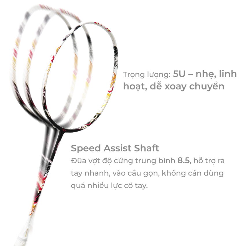 - Speed Assist Shaft Đũa vợt độ cứng trung bình 8.5, hỗ trợ ra tay nhanh, vào cầu gọn, không cần dùng quá nhiều lực cổ tay.